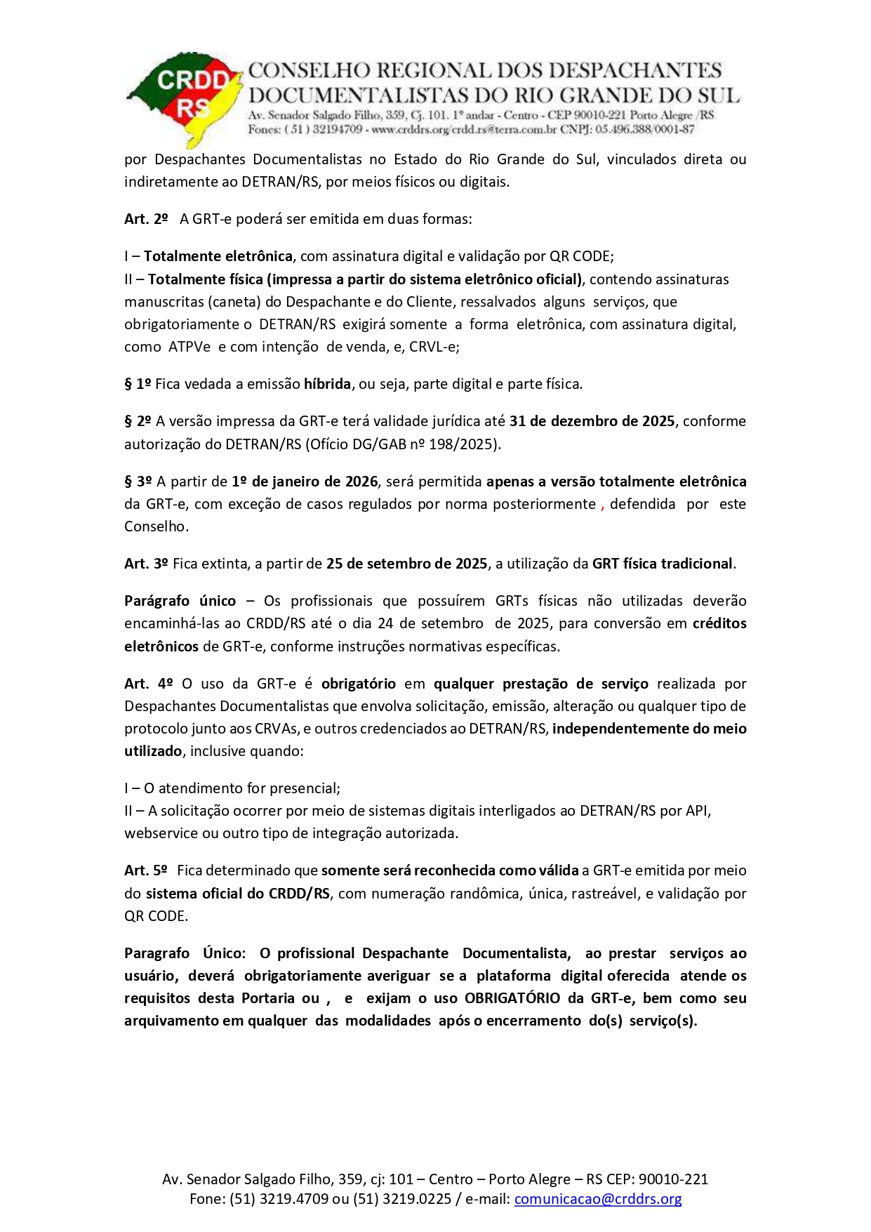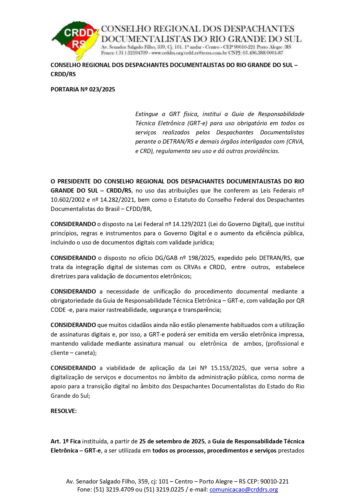 Portaria nº 023/2025 do CRDD/RS Extingue a GRT física, institui a Guia de Responsabilidade Técnica Eletrônica (GRT-e)